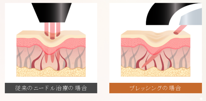 ブレッシングとは、微細な針を皮膚に対して斜めに進入させ、高周波エネルギーと薬剤を同時に届けるシステムです。