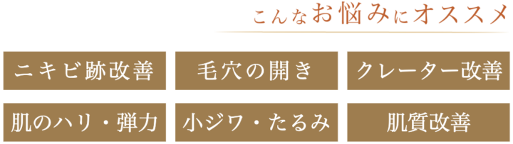 | 注意点 | 以下に該当する方は施術をうけることができません。 妊娠中・授乳中の方、ケロイド体質の方、施術部位に皮膚感染症(ヘルペス・湿疹など)がある方、重度のアレルギー体質の方、ペースメーカーや金属製インプラントを体内にお持ちの方、コントロール不良の糖尿病など、治療にリスクのある持病がある方 |