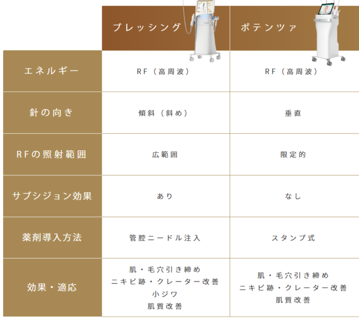 ブレッシングは傾斜の極細針+高周波+薬剤導入が特長のニキビ跡治療機器です。たとえばポテンツァは「点」での垂直照射ですが、ブレッシングは「斜め刺入」により熱を広範囲に届け面と立体で治療できます。