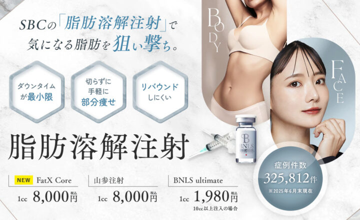 湘南美容クリニックの脂肪溶解注射は、お試しにはBNLSを、また一度で手ごたえのある効果を実感したい方には、デオキシコール酸が1%配合した高濃度の脂肪溶解注射がおすすめです。