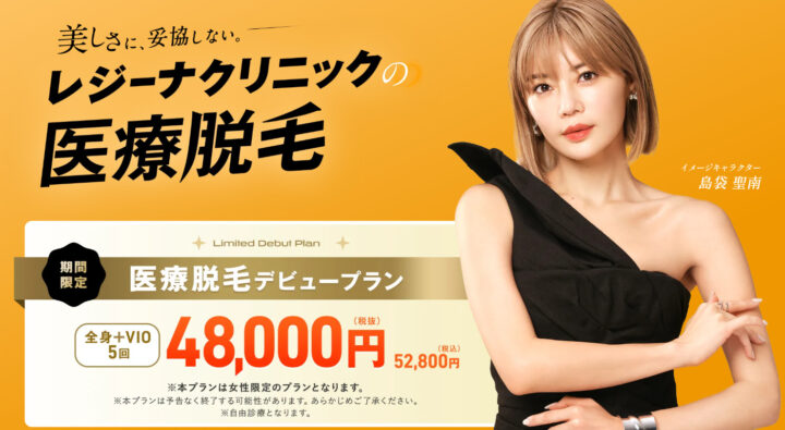 さらにあのレジーナが医療脱毛デビュープランをご用意!全身+VIO脱毛を5回52,800円で受けられます。「まずは手軽に全身の毛を減らしたい」という医療脱毛デビューの方におすすめのプランです。