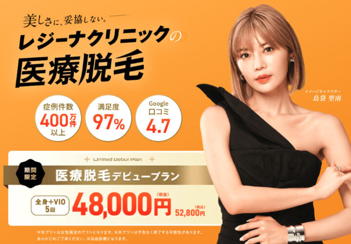 ぶっちゃけ医療脱毛は、倒産リスクが低い・ぼちぼち安い・脱毛効果が大きいクリニックが理想です。その3つが該当するのがレジーナクリニックです!全身+VIO脱毛を5回52,800円の安さで提供しています。