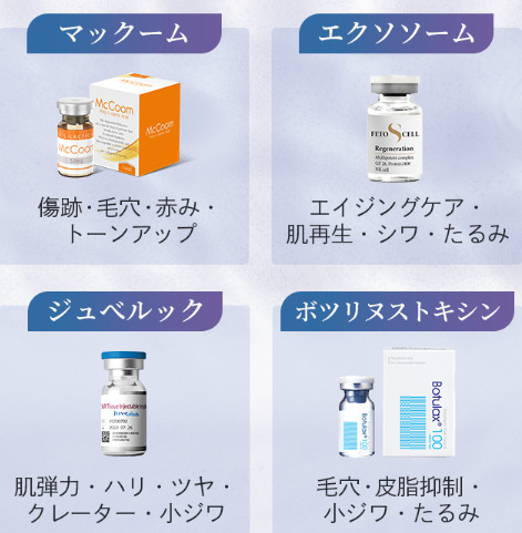 せっかくならキュアジェットで美容薬剤を肌内部に入れたいところです。ウィンクリニックは肌育製剤のトレンドが勢ぞろい!しかもマックームは1回19,800円、ジュベルックは1回28,000円の安さで導入できます。