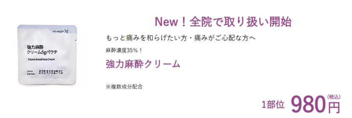痛みが気になる方には、2025年10月より登場したSBCオリジナルの「強力麻酔クリーム」がおすすめです。料金は従来の3,300円から980円に大幅にお得になり、さらに有効成分の濃度は約3倍にアップしています。