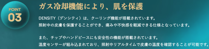 デンシティには5段階のレベルで調整可能なガス冷却機能が搭載されており、肌質や部位に合わせて冷却レベルを選択できます。高周波照射時の熱による刺激から皮膚を保護し、痛みや不快感を抑えることが可能です。