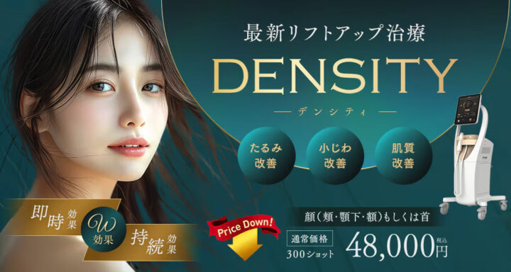 聖心美容クリニックは、デンシティを全顔1回121,000円、目周り1回88,000円で提供しています。医師が照射するドクターハイフとデンシティの併用も推奨されています。