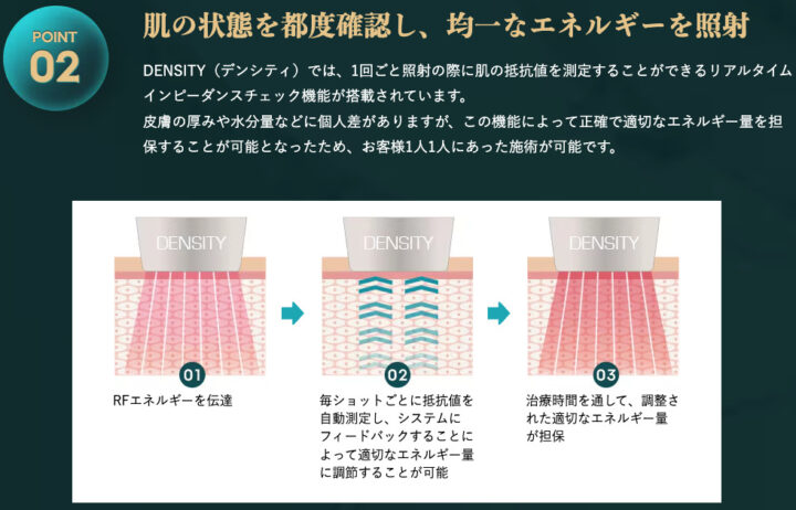 デンシティには、照射ごとに皮膚の抵抗値をリアルタイムで測定する機能が搭載されており、皮膚の水分量や厚みに応じて、エネルギー量を自動調整することが可能です。