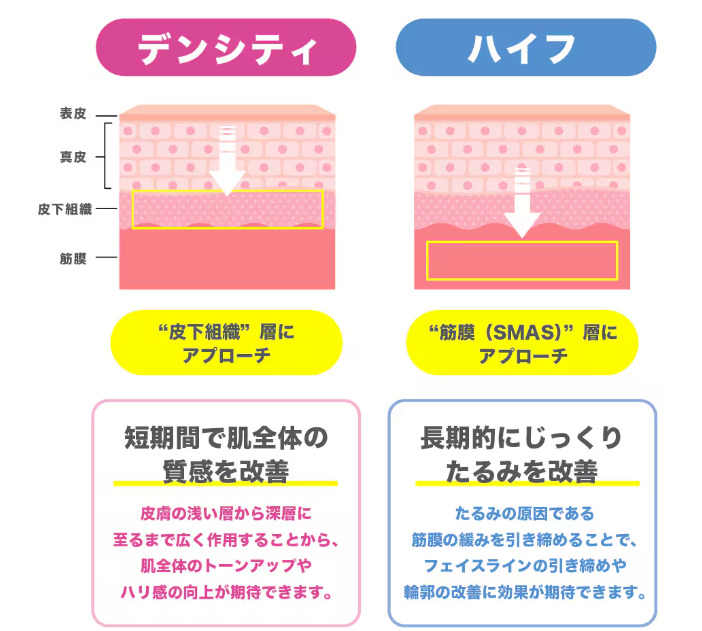 ハイフはSMAS筋膜に作用して土台から引き上げる一方、デンシティは真皮から皮下脂肪層まで広範囲を引き締める、という違いがあります。また併用することで相乗効果が得られます。