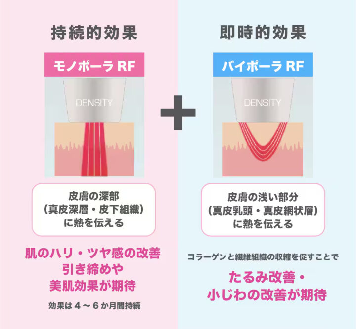 デンシティの特徴は、特許を取得している「モノバイ技術」です。「たるみ・シワの改善といった即時的な効果」が期待できるモノポーラRFと「肌のハリツヤ向上・毛穴の引き締めといった持続的な効果」が期待できるバイポーラRFを同時に照射します。