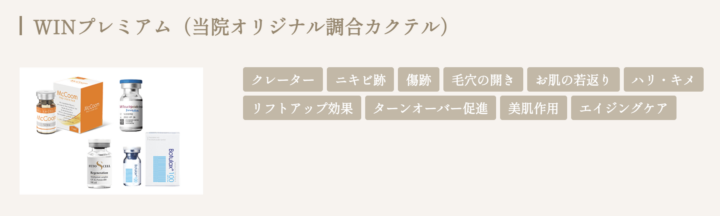 またウィンクリニックオリジナルの「WINプレミアム」は、クレーターやニキビ跡・毛穴・ハリなど様々な肌悩みをケアすることができて4万円以下とコスパが高いのでトータルケアで美肌を目指したい方におすすめです。