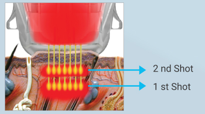 1回のショットで、皮膚の異なる2つの深さにRFエネルギーを連続照射できる「デュアルデプス・ダブルショット機能」を搭載しているため、従来の機器では2回(2パス)打たなければならなかったところを1回で済ませられるため、施術時間が半分に短縮され、肌への負担も軽減されます。