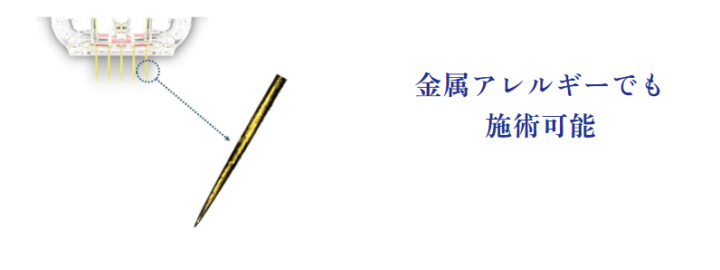 エリシスセンスの針には、絶縁処理を施した金メッキニードルを採用しています。そのため金属アレルギーのリスクを最小限に抑え、デリケートな肌質の方でも安心して受けられる設計です。
