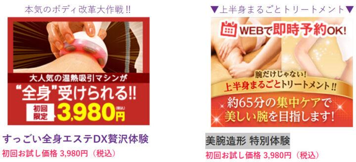 たかの友梨では、本気のボディ改革「すっごい全身エステDX贅沢体験 3,980円」や、上半身まるごとケア「美腕造形 特別体験3,000円」といった体験コースも用意されています。