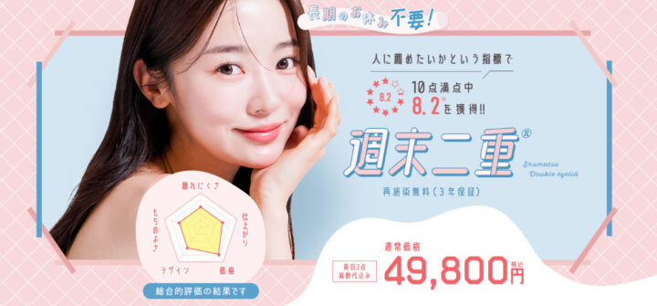 週末二重術の49,800円は、3年間の安心保証付き・正気麻酔代込みの価格です。また19歳以下の方は「Teen二重術」と称し、週末二重術と同じ術式による二重埋没法を39,000円で受けることができます。