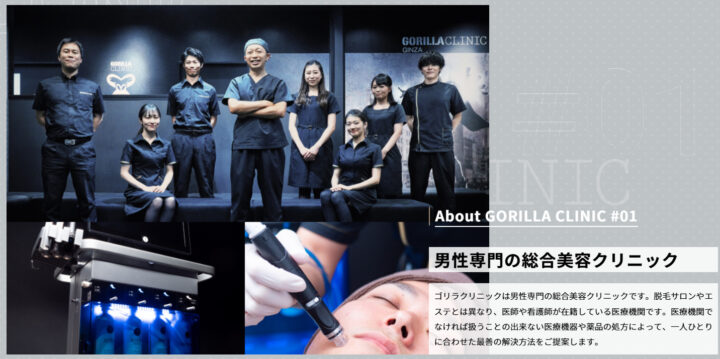 ゴリラクリニックは脱毛を中心とする男性専用の美容皮膚科です。ゴリラクリニック銀座院は、スタッフの適応力の高さが口コミで評判高く、男性特化型のクリニックならではの効果と満足度を提供しています。