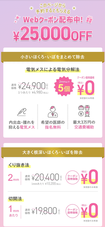 - web予約クーポン使用で0円~ほくろ除去ができる