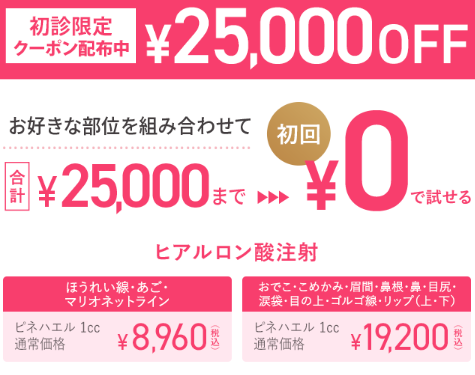 TCB八王子院にヒアルロン酸注入には、WEB予約で使える25,000円オフクーポンを活用できます。つまり、25,000円までのメニューであれば、無料になります。
