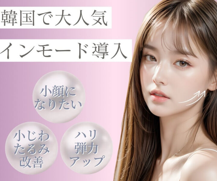 インモードは高周波エネルギーを使って脂肪細胞を減少、また、コラーゲン生成を促進して肌のハリや弾力向上、たるみの改善効果が期待できる、韓国でも流行した高周波たるみ治療です。