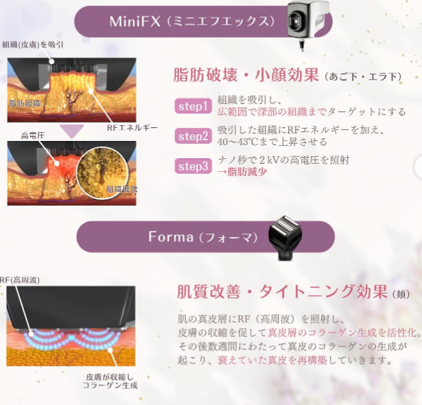 インモードFormaは、フェイスラインの引き締めとたるみの改善が期待できます。 インモードminiFXは、二重アゴや口横のポニョなど、脂肪が原因の老け見えが気になる方におすすめです。