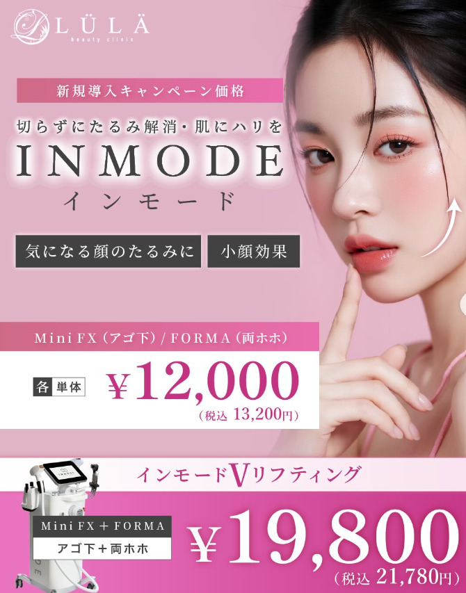 一度はやりたい大人気の韓国美容「インモード」、町田エリアではルラ美容クリニック町田院が1万円台で提供中です。インモードフォーマ・ミニFxは各1回13,200円Vリフティングは1回21,780円と安い価格設定を実現しています。