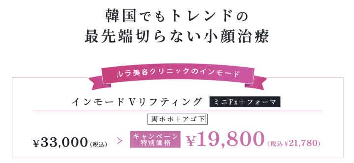 ルラ美容クリニック(東京7院)は、インモードミニFXとFormaを各13,200円、インモードリフティングを1回21,780円の安さで提供しています。相場を度外視した安さ!お試しならまずルラがおすすめです。