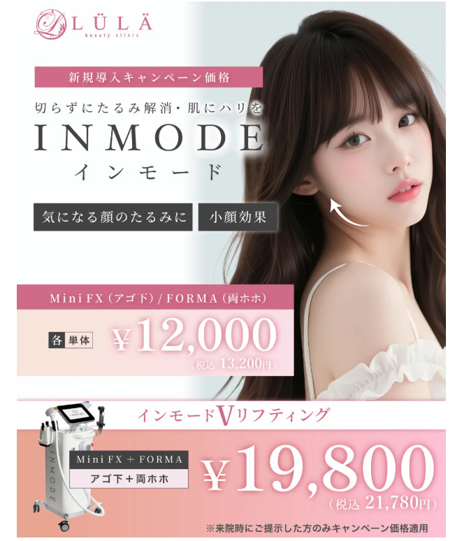 ルラ美容クリニック宇都宮院は、インモードForma・ミニFXを13,200円、インモードVリフティングを21,780円の感動プライスで提供しています。施術費用相場より圧倒的に安いため、お試しにおすすめです。