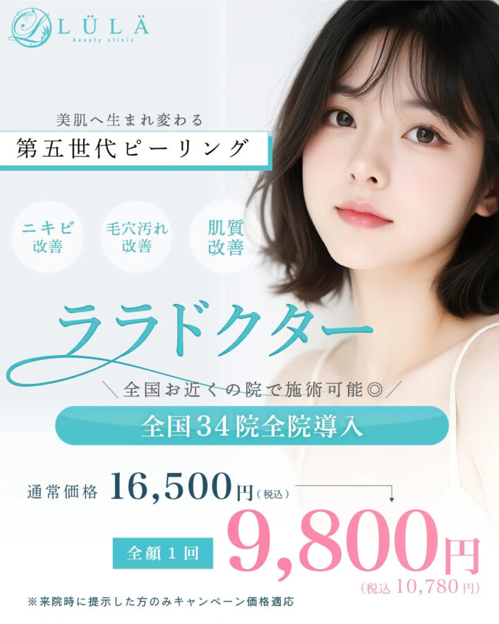 ルラ美容クリニックは、ララドクターを全顔1回10,780円の安さで提供しています。この抜群コスパは、美肌治療を諦めていた敏感肌の方や、これから肌管理を始めたいと検討していた方におすすめです。