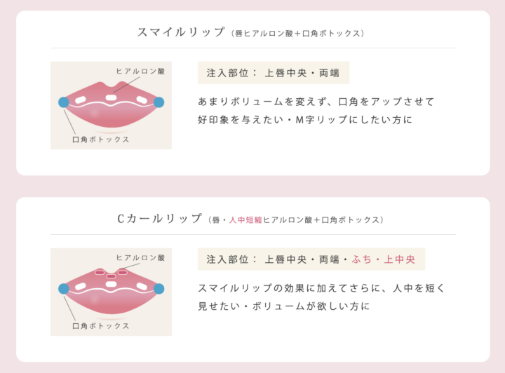 ルラ美容クリニックのスマイルリップ(唇ヒアルロン酸+口角ボトックス)と人中短縮ヒアルロン酸を組み合わせた人気の施術です。
