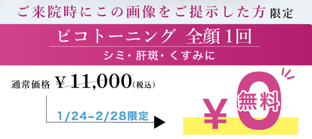 上記の画像保存必須です。ルラライト八王子院を訪れた際、上記の画像を提示するとピコトーニングが無料で受けられます。ダウンタイムがほとんどないため、気軽にトライするのがおすすめです。