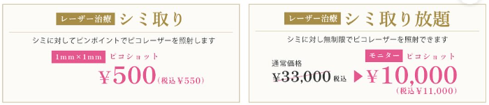 | シミ取り シミ取り放題 | シミ取り 1㎜550円 シミ取り放題 11,000円 | 詳細を見る |