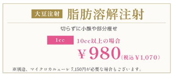 | 脂肪溶解注射 | 1cc 980円 ※10cc以上の場合 | 詳細を見る |