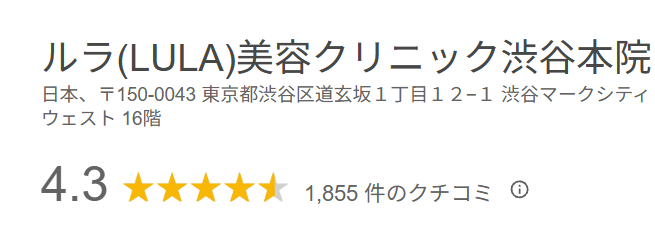ルラ美容クリニックは、Googleの口コミ全院平均4.6で評判高さが目立ちます。美容医療に初めてトライする方にも、かかりつけの美容クリニックをお探しに方にもおすすめです。