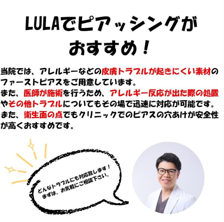 ルラ美容クリニックのピアス穴あけは医師が施術を担当します。万が一アレルギー反応がでた場合など、迅速な処置が可能です。