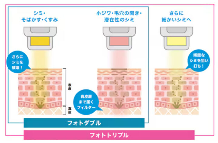 2つの光エネルギーを肌に照射する「フォトダブル」は全顔1回7,800円と破格の安さ!そして照射に加え、シミにスポット照射まで行う「フォトトリプル」は1回10,800円と、こちらも超リーズナブル価格で提供されています。