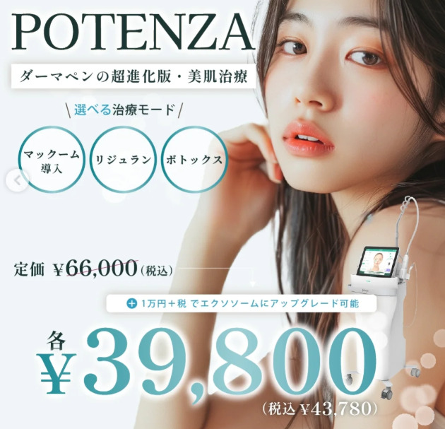 渋谷美容外科クリニックはポテンツァの取り扱いを開始、ポテンツァマックームを66,000円で提供しています。東京都内の料金相場は10万円前後なので、大幅に安い価格帯です。