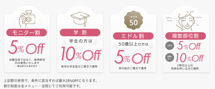 メディカルブローでは、割引を併用すると最大25%が適用されてお得に利用できます。学生のうちにアートメイクを受けたい方や、複数部位の施術を検討していた方とにおすすめです。(2025年10月時点)