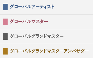 | グローバル グランド マスター | 国際大会入賞レベルの技術と、圧倒的な表現力と結果を残すランク。国際大会入賞レベルのアーティストを育成。 |