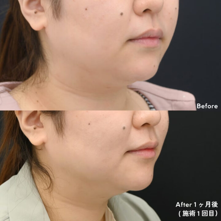 同時に真皮層のコラーゲン生成も促進されるため、脂肪減少による小顔効果とリフトアップ効果が同時に期待できます。フェイスラインや顎下のたるみの改善に有効です。