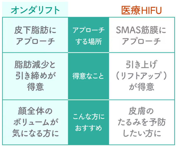 オンダリフトはマイクロ波で脂肪層を加熱して脂肪細胞を破壊するのに対し、医療ハイフは超音波で筋膜層に熱エネルギーを届け、肌の土台から引き上げることを目的としたたるみ治療です。