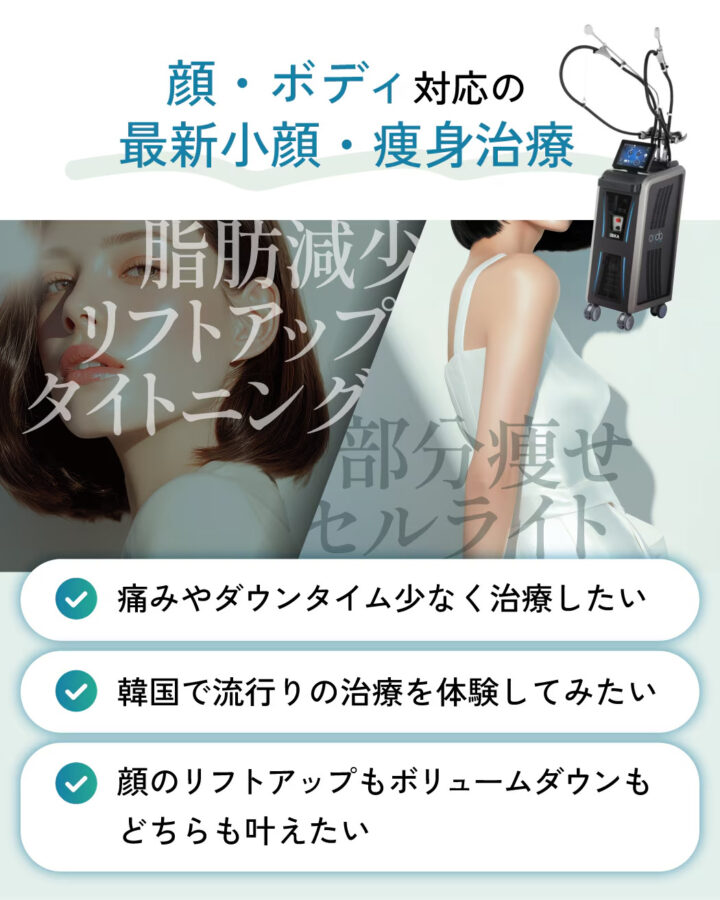 | 注意点 | 妊娠中・授乳中の方、施術部位に金属(インプラントなど)が入っている方、重度の肌疾患がある方は施術を受けることができません。また極端に脂肪が少ない部位には照射できないため、頬がこけている方などは施術を見合わせるか、他の治療と組み合わせる場合もあります。 |