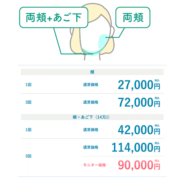 | 料金 | (両頬) 27,000円 (両頬+アゴ下) 42,000円 (ボディ:1部位) 36,000円 |