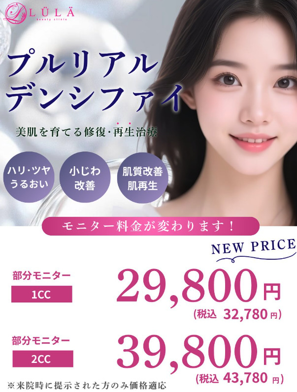 ルラ美容クリニック広島院はあなたの肌育を大応援!プルリアルデンシファイを1回(1cc)32,780円の安さで提供しています。1回で手ごたえのある効果を実感したいなら2cc43,780円もおすすめです。