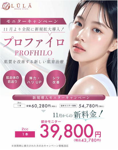 ルラ美容クリニック仙台院は、モニター募集中でプロファイロを全顔1回43,780円の安さで提供しています。ルラは強引な勧誘の心配がなく、丁寧なカウンセリングや施術に定評があるのも魅力の一つです。