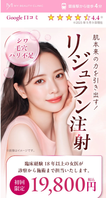 MY BEAUTY CLINICではリジュラン注射が、初回限定で19,800円の格安で受けられます。
