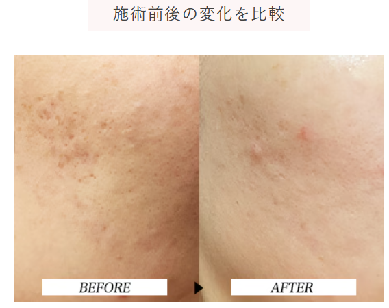 ピコフラクショナルの特徴は、皮膚表面を大きく傷つけず、内側から細胞の再生を促します。治癒の過程でコラーゲンやエラスチンの生成も促進されるため、ニキビ跡の改善だけでなく、毛穴の引き締めや肌質の底上げにつながる点も特徴です。
