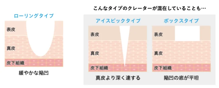| 適応クレーター型 | ・ローリング型(楕円形・波打った凹み) →最も効果が期待しやすい ・ボックスカー型(側面がはっきりした深めの凹み) →効果あり ・脂肪萎縮型 →効果あり ※アイスピック型(点状に深い)は適応外の場合が多い |
