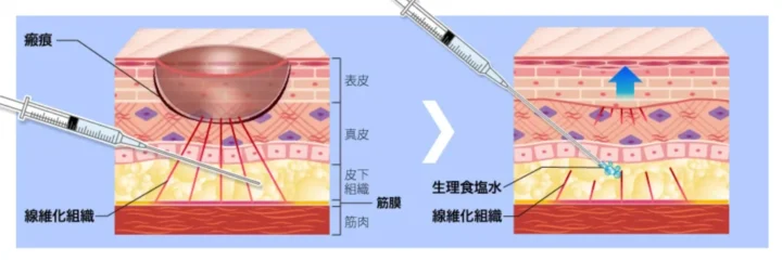 | 施術原理 | ① 皮膚を下に引っ張っていた線維を切ることで表皮が持ち上がる ② 傷の治癒過程でコラーゲン産生が促進され、 凹みが徐々に改善される |