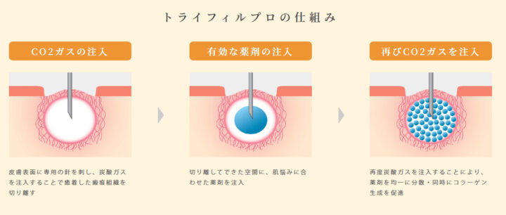 トライフィルプロは炭酸ガスによるサブシジョンと均一な薬剤導入を組み合わせた美肌治療機器です。極細の針で炭酸ガスを注入し、皮膚深部の癒着した瘢痕組織を剥離してから、肌悩みに適した薬剤を注入します。