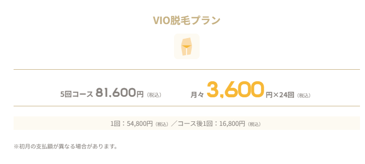 | おすすめポイント | VIO脱毛5回コースが 業界最安級の48,000円 | 9,800円でVIO脱毛 を試せる | 全身+VIO脱毛が 72%OFF | 脱毛施術満足度96.4% | 都度払い可! 16,500円と良心的価格 | 割引併用で 最大40,000円OFF | Google口コミ 平均★4.3以上 | SNSで話題の 高性能脱毛機を使用 | 脱毛機を選べる オーダーメイド脱毛 | 21時まで営業! 忙しい方も通いやすい |