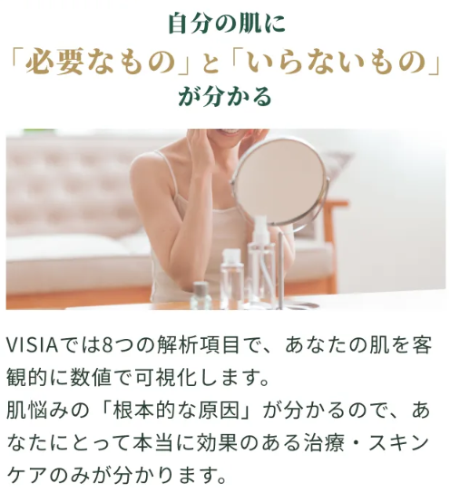 VISIA肌診断で行きました。沢山勉強になることを教えていただき、その点は満足しています。淡々と情報提供と最適な提案はしていただけます。